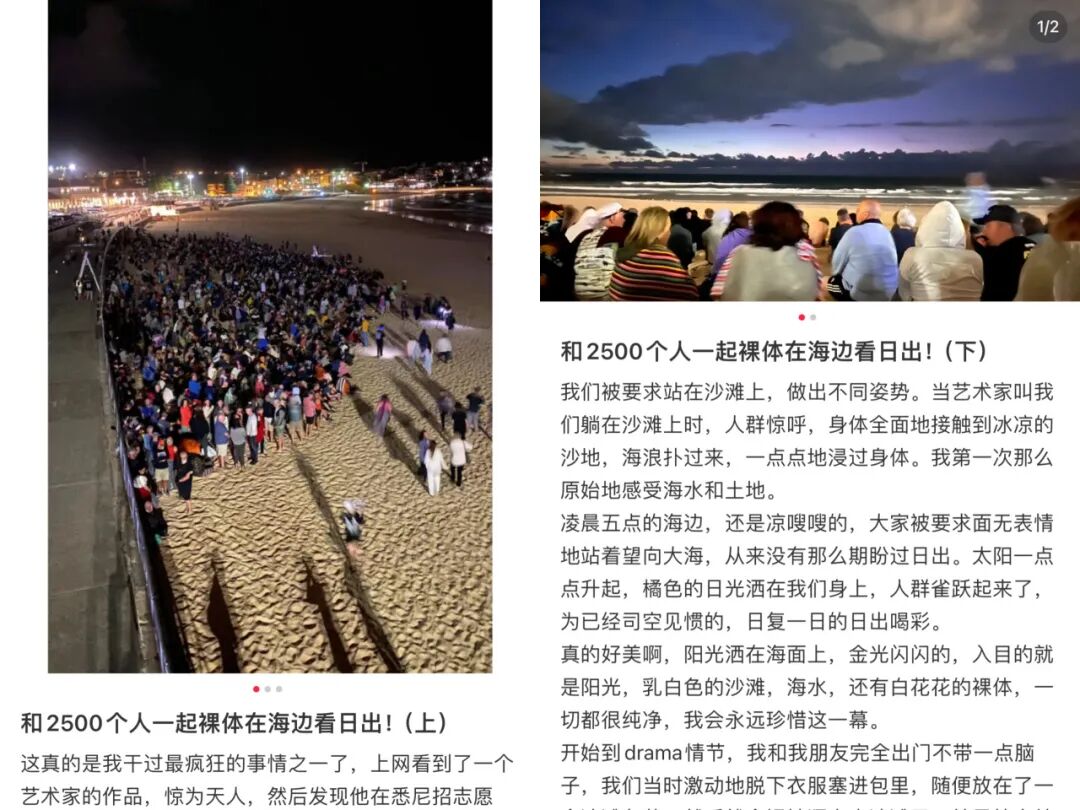 也许很多人不理解,又或许她做了很多人想做而不敢做的事,但若了解缘由,人们会发现招募2500名志愿者去悉尼的海滩裸体等待日出这个作品源于一个艺术家为了唤醒大众对皮肤癌的重视,呼吁社会去做皮肤检查。也许人们会看到滑稽的有色的那一面,但其带来的社会意义远高于此,不必有任何负担和羞愧,在自然中自由地寻找自己。而这个作品也切实地唤醒了她检查皮肤的意识,一颗黑色素瘤就是她本次的“收获”,她提早的发现并切除已是不幸中的万幸。