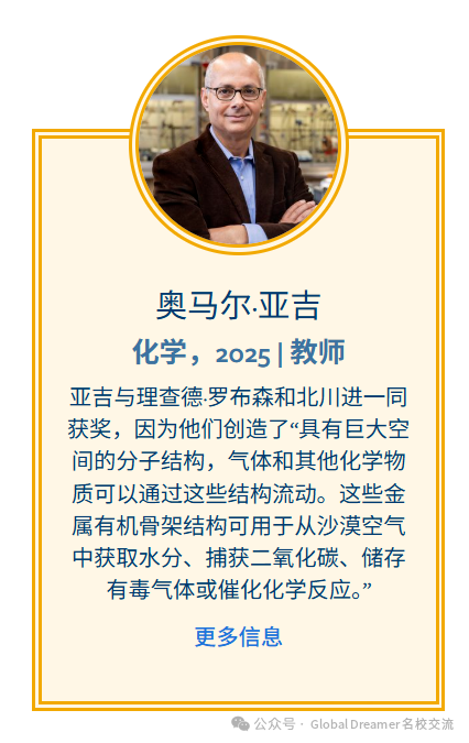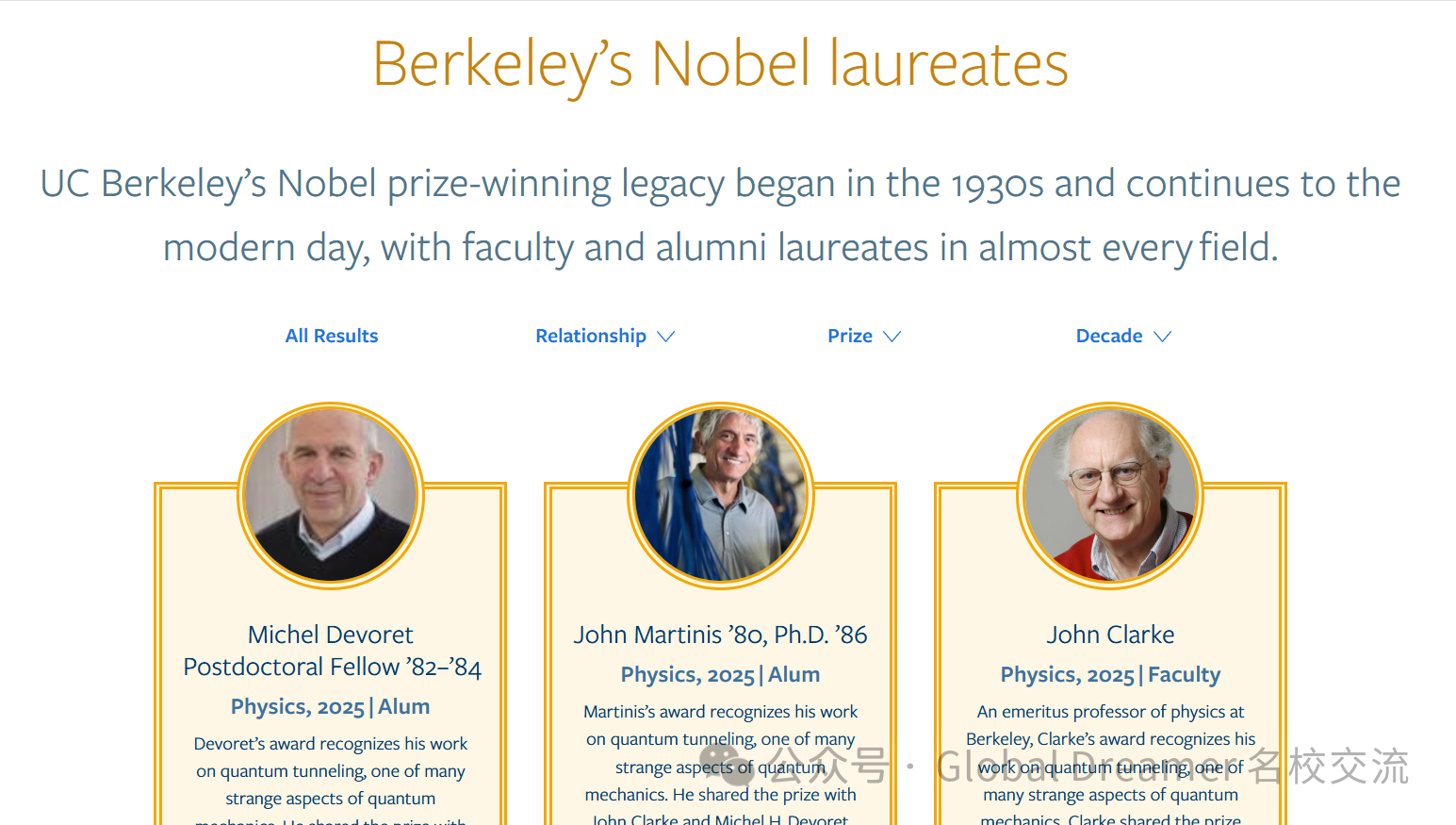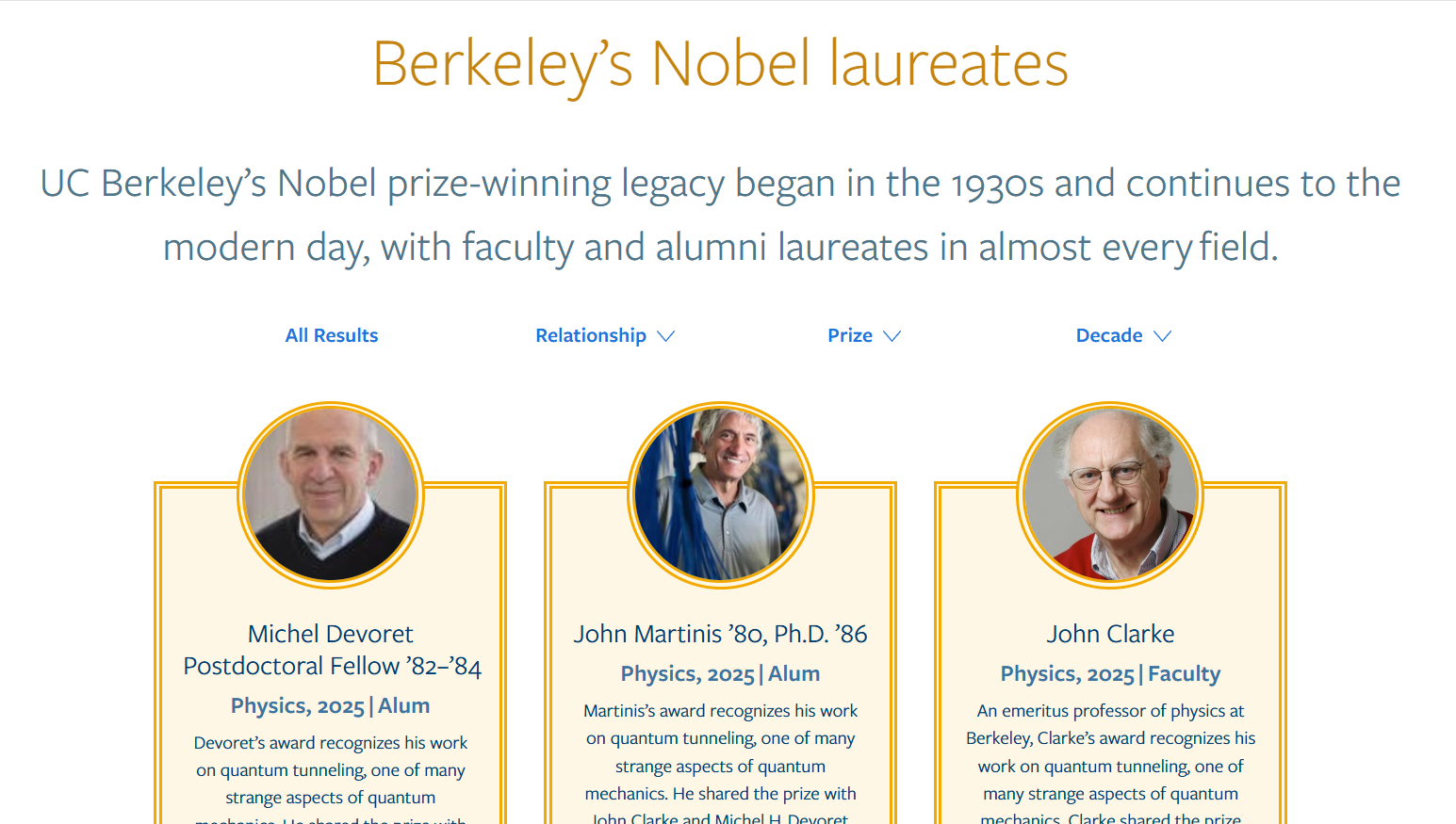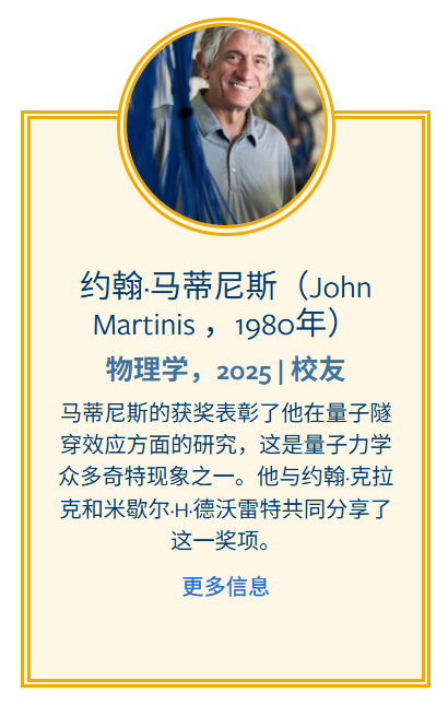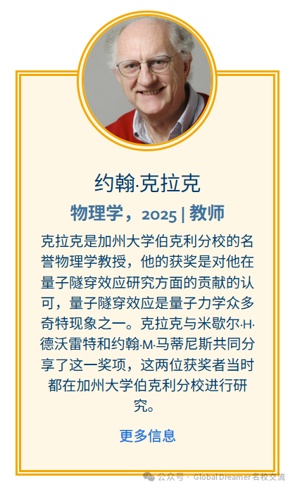 近日,UC Berkeley 物理系荣誉教授 John Clarke 获2025年诺贝尔物理学奖,与前Berkeley研究者 Michel H. Devoret 和 John M. Martinis 共享荣誉。<br><br>John M. Martinis — 伯克利物理学士、博士,量子计算先锋<br>Michel H. Devoret — 伯克利博士后,现任耶鲁教授<br>John Clarke — 伯克利物理系荣誉教授、本届诺奖得主 🎉<br><br>他们因发现宏观量子隧穿及电路能量量子化而获奖——这可是量子计算的基石,推动了从加密到AI的革命性进步!<br><br>紧接着,化学系教授 Omar Yaghi 斩获2025年诺贝尔化学奖,与 Richard Robson 和 Susumu Kitagawa 共同获奖。<br><br>⚗️他的“网状化学”发明了金属有机框架(MOFs),能从沙漠空气中“捕获”水、吸附CO₂、存储毒气,甚至催化反应——环保救星,助力碳中和梦想!<br><br>🏆想跟诺奖大牛学点啥?来UCB上课吧!<br>x26lt;a href=x26quot;https://mp.weixin.qq.com/s?__biz=Mzk0MDg3MzUwOA==x26amp;amp;mid=2247506001x26amp;amp;idx=1x26amp;amp;sn=13e71966213b620af18bb983f1d22c29x26amp;amp;scene=142#wechat_redirectx26quot; class=x26quot;normal_text_linkx26quot; target=x26quot;_blankx26quot; data-itemshowtype=x26quot;0x26quot;x26gt;【学期项目】UCB加州大学伯克利分校Haas哈斯商学院学期交流项目!卷王之选!x26lt;/ax26gt;<br>x26lt;a href=x26quot;https://mp.weixin.qq.com/s?__biz=Mzk0MDg3MzUwOA==x26amp;amp;mid=2247506115x26amp;amp;idx=1x26amp;amp;sn=323b53d195bd1cfee9bb4004276706d1x26amp;amp;scene=142#wechat_redirectx26quot; class=x26quot;normal_text_linkx26quot; target=x26quot;_blankx26quot; data-itemshowtype=x26quot;0x26quot;x26gt;【学期项目】UCB全球访学BGA学期学分项目持续申请中!x26lt;/ax26gt;<br>x26lt;a href=x26quot;https://mp.weixin.qq.com/s?__biz=Mzk0MDg3MzUwOA==x26amp;amp;mid=2247506168x26amp;amp;idx=1x26amp;amp;sn=6504a657108b2bbfe9b5160cd96b6d9ax26amp;amp;scene=142#wechat_redirectx26quot; class=x26quot;normal_text_linkx26quot; target=x26quot;_blankx26quot; data-itemshowtype=x26quot;0x26quot;x26gt;【项目申请】2025年UCB加州大学伯克利分校物理学院BPIE学期项目秋季学期申请倒计时!x26lt;/ax26gt;<br><br>🔥John Clarke(退休教授):曾主讲 Physics 137: Quantum Mechanics(量子力学)和 Physics 230A: Advanced Quantum Mechanics(高级量子力学)。这些课深挖量子奇妙世界,适合物理迷钻研隧穿与超导。<br><br>🔥Omar Yaghi:主打 Chemistry 120A: Physical Chemistry(物理化学)和 Chemistry C130: Introduction to Inorganic Chemistry(无机化学导论),聚焦分子构建与材料设计,启发你设计“海绵”般的神奇框架。<br><br>🚗 校长的小烦恼:伯克利专设“Nobel Laureate Parking”诺奖专属车位,如今获奖者太多……车位快不够用了 x26lt;a href=x26quot;https://mp.weixin.qq.com/s?__biz=Mzk0MDg3MzUwOA==x26amp;amp;mid=2247502466x26amp;amp;idx=1x26amp;amp;sn=c3109ff2c531ff92e1d2e7a95c3e1b56x26amp;amp;scene=142#wechat_redirectx26quot; class=x26quot;normal_text_linkx26quot; target=x26quot;_blankx26quot; data-itemshowtype=x26quot;0x26quot;x26gt;想在加州大学伯克利分校停车?先拿个诺奖吧!x26lt;/ax26gt;<br><br>在伯克利,课堂不仅传授知识,更教你改变世界。💡 伯克利精神:不止是知道,而是敢于提问、勇于创新!