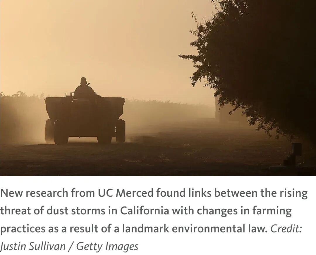 加州大学默塞德分校的研究团队通过分析证实,为节约地下水而增加的农田休耕(弃耕)是加剧加州严重沙尘暴的关键人为因素。研究发现,中央谷地占加州休耕土地的77%,却与88%的严重沙尘暴事件相关。同时,研究提出了直接解决方案:在休耕土地上种植覆盖作物,可有效固土防风。