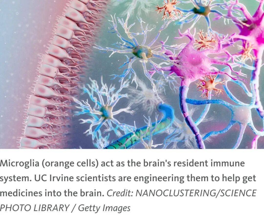治疗阿尔茨海默病等脑部疾病的最大挑战,是药物难以穿透“血脑屏障”。加州大学尔湾分校的科学家另辟蹊径,利用CRISPR基因编辑技术,将大脑自身的免疫细胞——小胶质细胞——改造成了“智能快递员”。