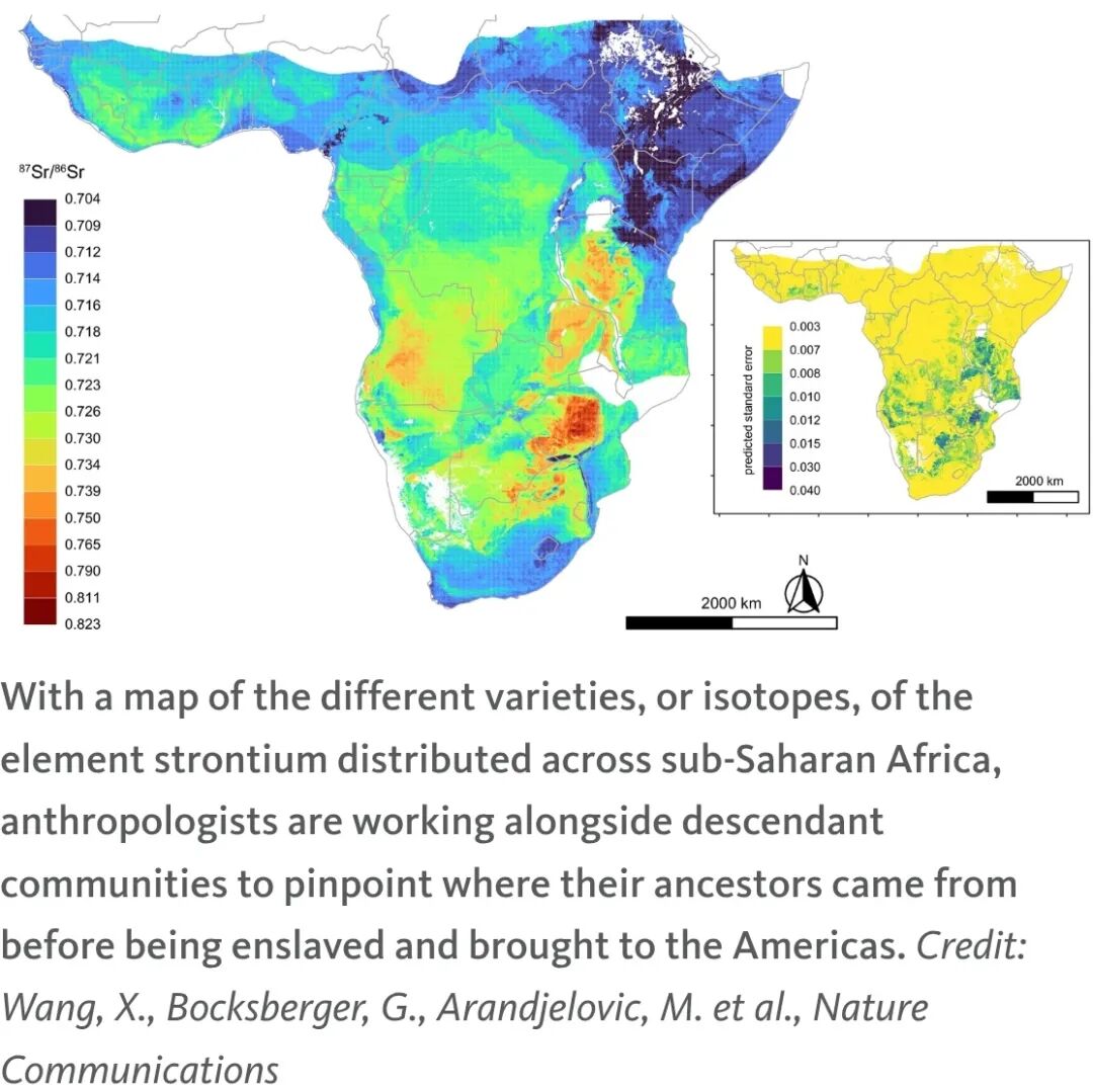 加州大学圣克鲁兹分校的考古学家团队创建了首幅详细的撒哈拉以南非洲锶同位素地图。地球不同地区的岩石和土壤拥有独特的锶同位素“指纹”,会留存于当地居民的骨骼中。通过分析美洲第一代被奴役者遗骸中的同位素,并与这张涵盖2000多个样本的非洲地图进行比对,可以精确定位其祖先在非洲的具体生活区域。