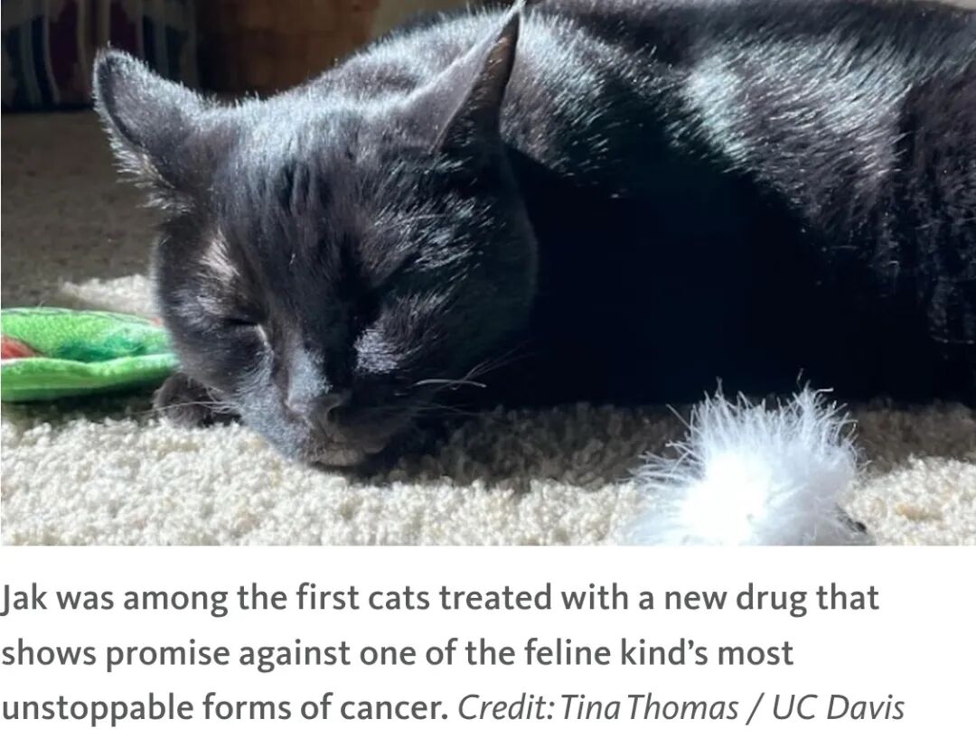 家猫Jak不幸罹患恶性口腔鳞状细胞癌,在被宣判仅剩六周生命时,一项在加州大学戴维斯分校进行的临床试验带来了转机。该试验药物由加州大学旧金山分校研发,在NIH资助的试验中,成功延缓了35% 患猫的疾病进展,且副作用小。