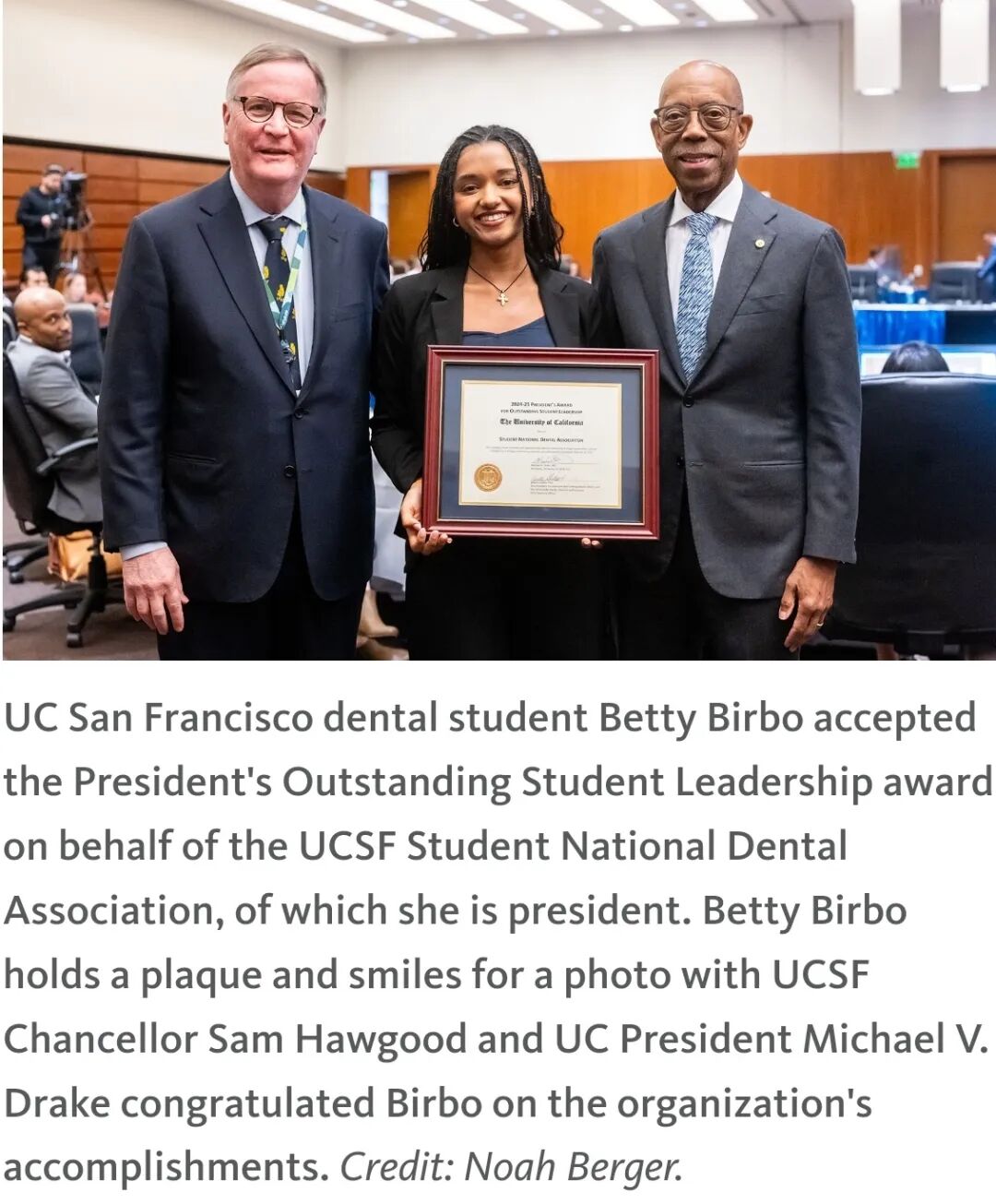 UCSF全国牙科学生协会获得了校长颁发的杰出学生领导力奖,该组织旨在促进牙科学校和牙科专业内的多样性。