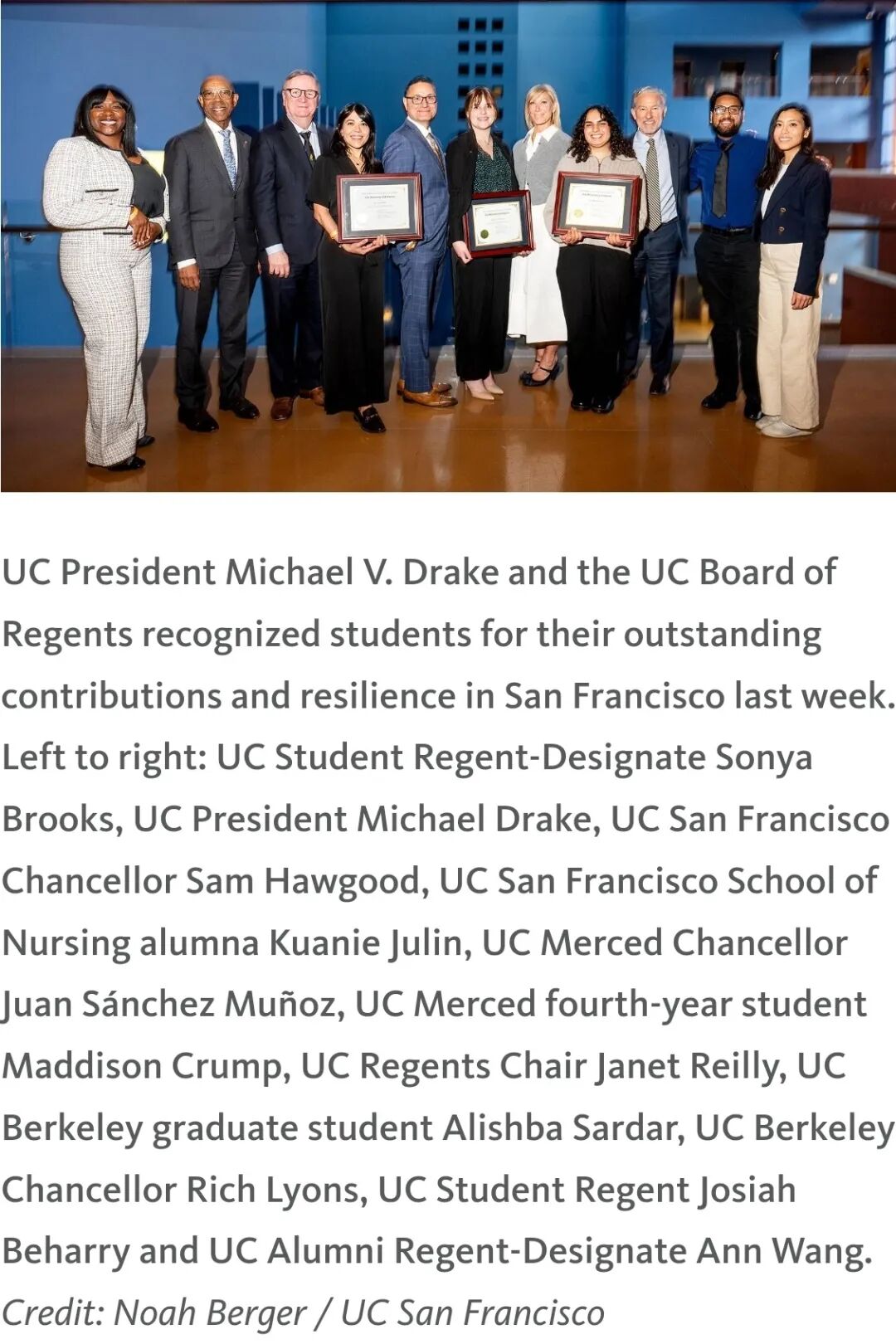 2025年,加州大学校长迈克尔·德雷克和校董会共同表彰了一批特殊的学生。他们中,有人曾是寄养系统的孩子,有人来自医疗服务缺乏的社区,有人为少数群体争取医疗平等权益。奖项分为两类:总统杰出学生领导力奖和校董会寄养青年奖。