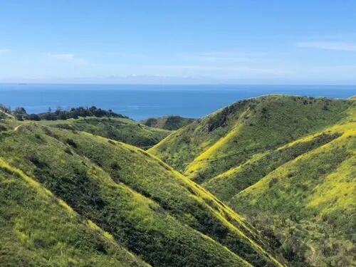 继续沿Rising Sun Trail爬上高地,环绕峡谷顶行走,太平洋会突然出现在眼前,蓝色海面与金色山谷形成鲜明对比。下坡时穿过蕨类植物与现代感栅栏,轻松回到起点,全程风景层层递进,不会觉得单调~