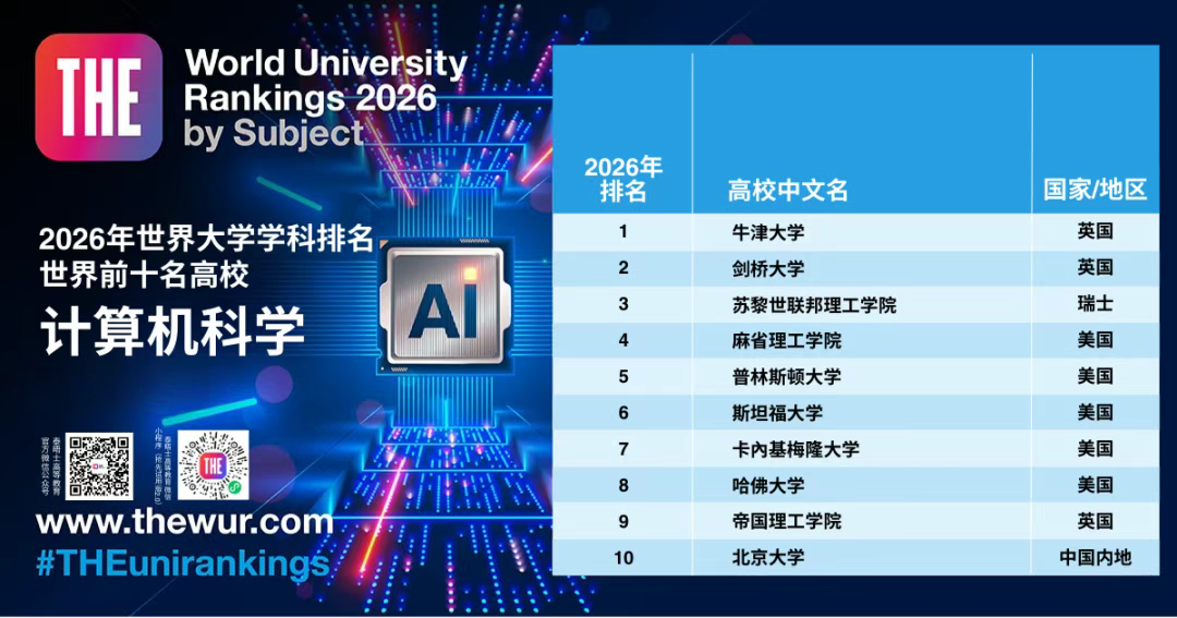 榜单显示,牛津大学稳居该学科全球榜首;剑桥大学与苏黎世联邦理工学院分别位列第二、第三;麻省理工学院今年排名下滑至第四;北京大学则首次闯入世界前十行列。