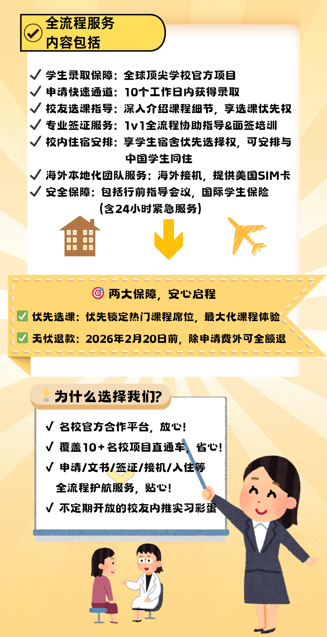 · 安全保障:行前指导会议,国际学生保险(含24小时紧急服务)